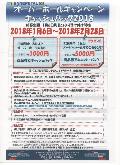 Arrows ご用達のエナペタルショックアブソーバーのオーバーホールキャンペーンが来年1月6日から始まります♪ 遠方のお客様は取り外したショックアブソーバー(ビルシュタイン製品またはエナペタル製品)を Arrowsに送っていただいても結構ですよ。 詳しい内容につきましては、上のチラシをご覧ください。 よろしくお願いします♪
