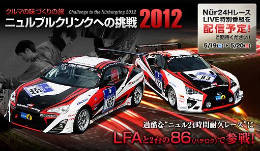 GAZOO Racing から2台の86がニュル24時間耐久レースに出場するそうです。 5月19日(土)から20日(日)にかけて、こちら(http://gazoo.com/racing/grmn/nur2012/index.asp)で画像配信されるそうなので、みんなで応援しましょう♪