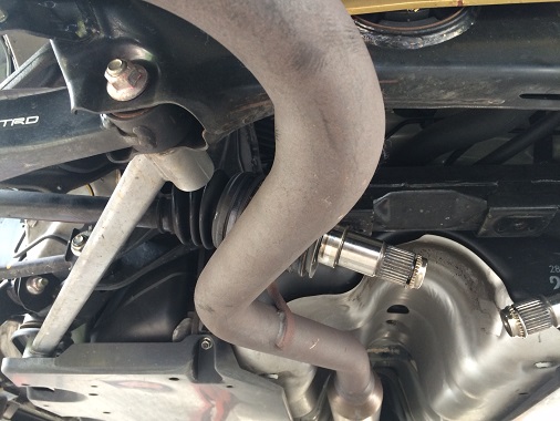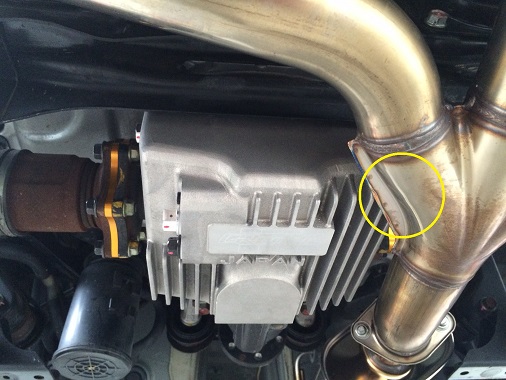 S2000にトラスト製大容量デフケースとドライブシャフトスペーサーを取り付けさせていただきました。 ありがとうございます♪ 純正の 0.8Lに対して 2.3Lまでオイルの容量を大幅にアップすることが出来る優れものですよ♪ ところが・・・黄色〇の部分で、装着されていた マフラーと干渉してしまうことが判明。(汗)
