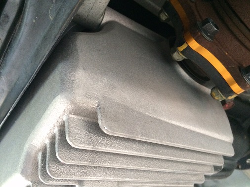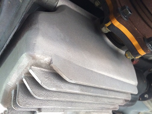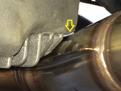 少しづつ削っては干渉する部分を確認して・・・を繰り返し、フィンとマフラーが干渉しなくなったものの、今度はデフケース本体(黄色い矢印で示した部分)とマフラーとのクリアランスが 5㎜程度しかないことが判明。 マフラーを手で揺するとデフケース本体に接触してしまいます。。。(涙) 走行中にマフラーが揺れて接触を繰り返すのは好ましくないので・・・