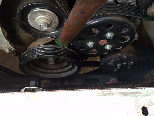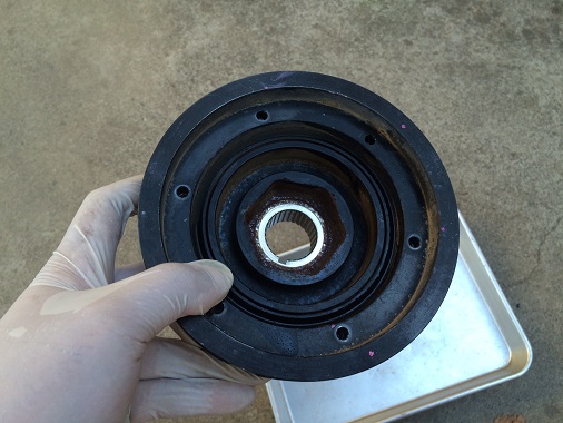 しばらく頑張ってみたのですが、どうしようもないのでそのままエンジンから外すことにしましたよ。 文字にすると簡単ですが・・・プーリー固定用のレンチが使えなかったり、ステアリングラックを外さないとプーリーを引き抜けなかったり、結構大変でした。