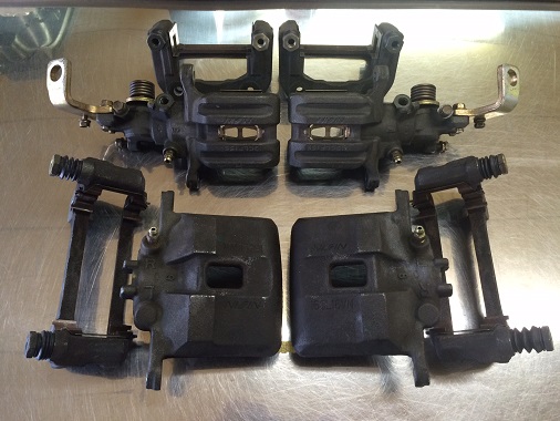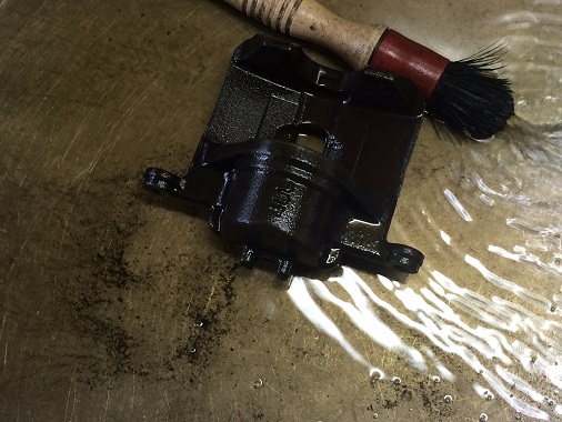 降ろしたキャリパーを全てバラして、パーツを一つ一つ洗浄台で洗っていきます。 洗浄液の下にたくさんの汚れが溜まっているのがお分かりいただけるでしょうか。 軽く流してもこれだけの汚れが落ちます。 ピストンやシリンダーの間に汚れが入り込むと、交換したばかりの新品のシールを傷つけフルード漏れの原因になってしまいます。 徹底的に汚れを洗い流すのは、オーバーホールで一番重要な作業です。