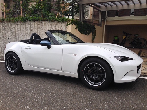 NDロードスターのお客様に CE28 CLUB RACERをご購入いただきましたよ♪ う~ん、メチャクチャカッコイイ!! CLUB RACER専用のマッドダークガンメタ&ダイヤモンドカットリムが NDロードスターをより一層スポーティーに演出していますね。 サイズも 16×7J+33を選ぶことで走りのイメージが格段にアップしました。 タイヤもサーキット走行を照準に ZⅡ STAR SPECに履き替えました。 そして、ドアミラーハウジングもブルーリフレックスマイカにチェンジ!! 白色系ボディーにソウルレッドプレミアムマイカを選ぶオーナーさんは多いですが、ブルーリフレックスマイカもとても良い感じですね! 個性的でカッコイイ NDロードスターができました♪