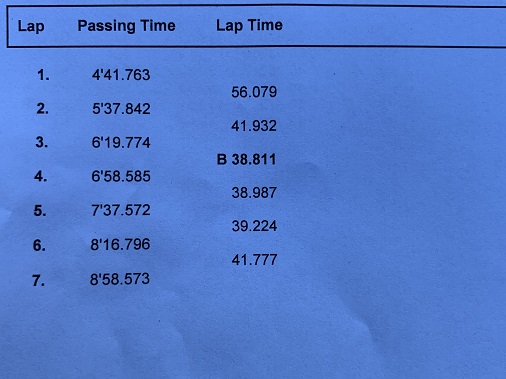 3コーナーのヘアピンもクリッピングポイントを外してしまいましたが、何とかまとめて 38秒811を出すことが出来ました。 その後、アンダーを出さないようにアタックしてみたものの、タイムが落ちていく一方でした。。。