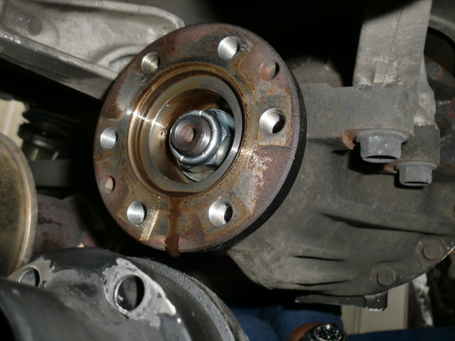 サイドブレーキをかけてコンパニオンフランジを回してみたところ、バックラッシュは大きくなってないようでしたが・・・前回のクラッチ交換で発見されたコンパニオンフランジからのオイル漏れが再発していました。。。(涙)