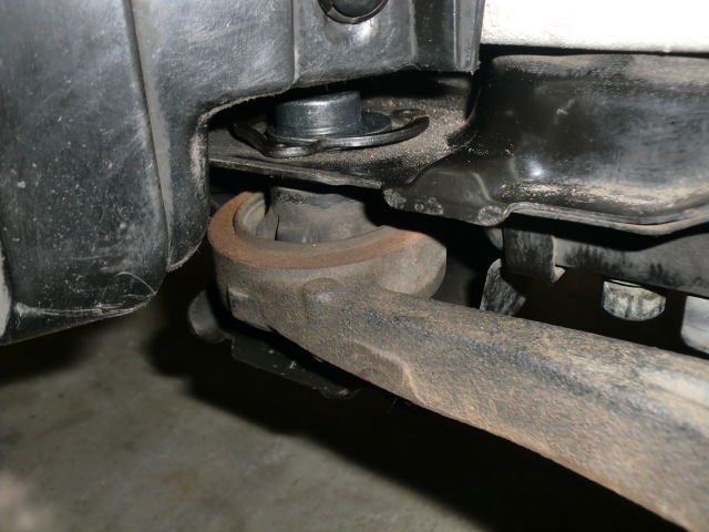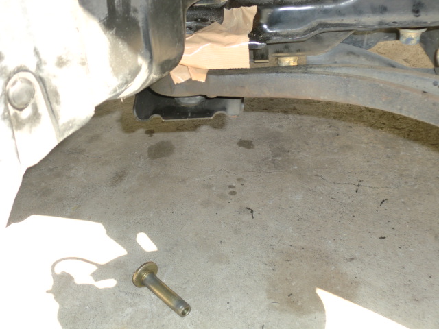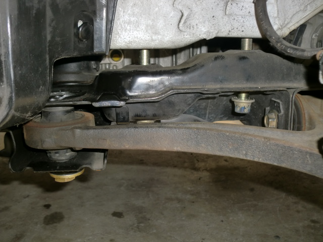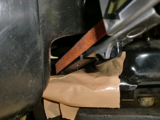 これも高○号の写真です。 潰れてしまったカムカラー先端を削るため、サブフレームを下げてベルトサンダーが入るクリアランスを確保。