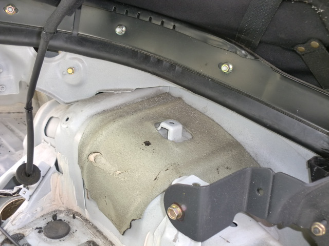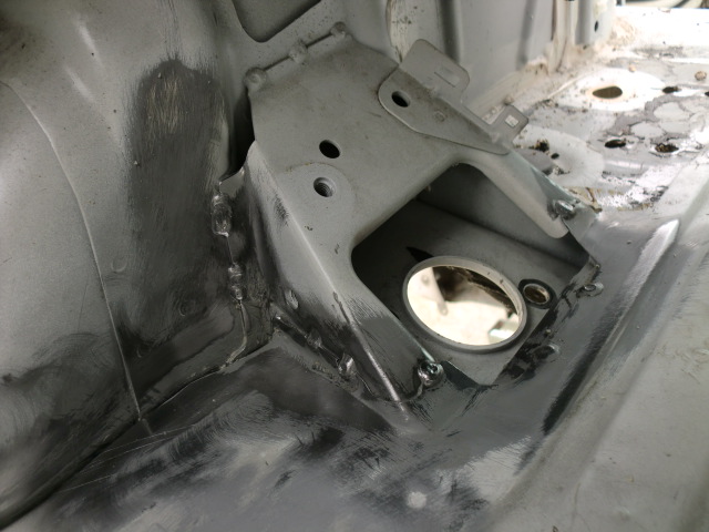 こんな感じで僅かづつながら作業を進めています。 写真は左後ろのホイールハウスです。 メルシートを剥ぎ取り、シーラーを削ぎ落としてクリーニングしたあとサビ止めをします。 長期決戦?が確実のため、後々大変なことにならないようにサビ止めをしっかりしておきます。