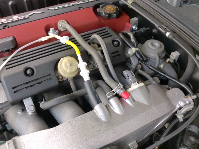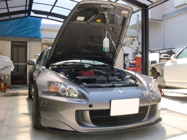 RECSをインマニから注入してエンジン内を洗浄しています。 まるで点滴をしているようですね。(笑) 写真では判り難いですが、マフラーから煙が出ています。 WAKO'Sの営業さん曰く、この煙がエンジン内部の汚れというわけではないそうですが、汚れているクルマほど煙が出るそうですよ。 また、RECSで定期的にエンジン内洗浄をするのが効果的とのこと。 1年に一回くらいが良いそうです♪
