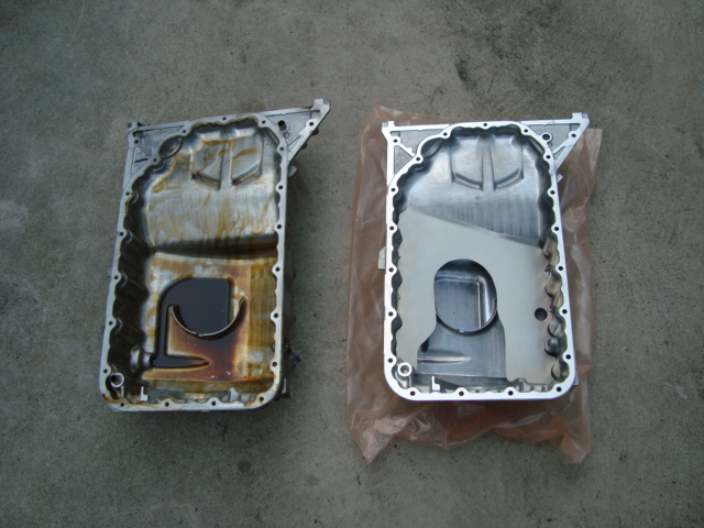 左が純正、右がJ'sレーシングさんのバッフル付きオイルパン。