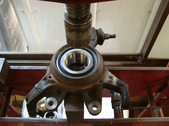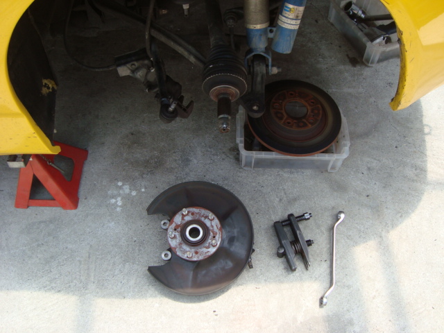 プレスでベアリング&ハブボルトを抜いて、パーツが到着するまで待機します。