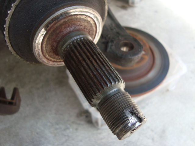ドラシャアウトボードです。 以前、異音がするということで錆を落としてグリスを塗った左側は問題ないのですが、右側は酷く錆びていましたよ。 周期的に「キッキッキ!!」「シャッシャッシャ!!」という異音がリア周りからする場合は、この錆が原因であることが多いですね。 また、何故か左側から異音が発生します。(右側はこの状態でも異音が出ていませんでした。) 理由は???ですが、このような症状が出た場合はスプラインの錆を落とすと直る可能性がありますよ。