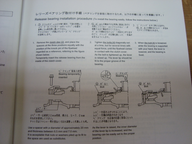 取り付けで純正と大きく違うところは、レリーズベアリングをクラッチカバーの板バネに噛ませること。 一旦バラして取説通りに組み込みます。