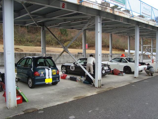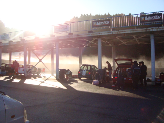 「2009 King of K-Car 6時間耐久レース」当日は朝から快晴!! 前日の雨で路面が濡れていますが、乾いてくれることを祈りつつ準備を始めます。