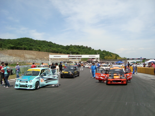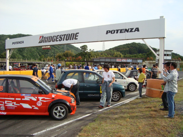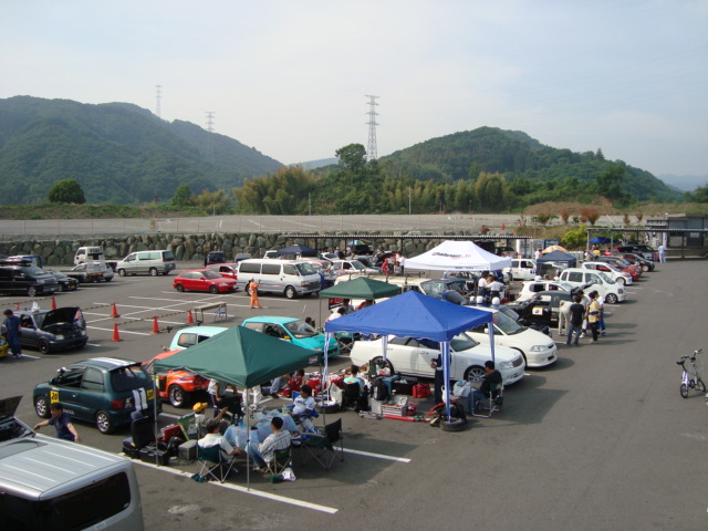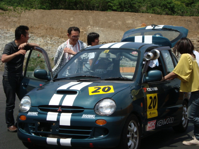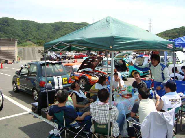 積載車で運ばれてくるライバルマシンが多い中、ナンバー付けて自走してきた代車ミニカ・・・積んできた荷物を取り降ろし準備に入ります。 といっても、大したことはないので一人でやっちゃいますよ。 ドライバーのみなさんは、ご歓談中~!!(笑)