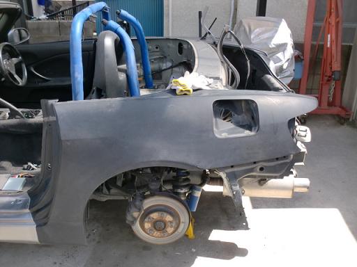 うえっち号のリアフェンダーパネル交換も中盤戦に入ってきましたよ。 新しいパネルを借り合せしてパネル同士の「合い」を確認します。 「合い」の悪いところはハンマーで叩いて修正、パネルボンドで接着しますよ。