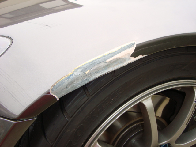 一見ノーマルのフェンダーですが・・・裏側を見ると、純正フェンダーカット&鉄板溶接で横方向へ広げ、ローオフセットホイールを履かせることが出来るようにオーバーフェンダー加工してあります。 更にノーマル風に仕上げるため、所謂“ミミ”の部分をパテで整形して作ってあります。 割れてしまったのは、そのパテの部分。 Arrows板金部門の職人さんもその作りを見ながら、「すごく手間が掛かってますね~。」と感心していました。 しかしながら今回、その凝った作りが仇となってしまうとは・・・。(涙)
