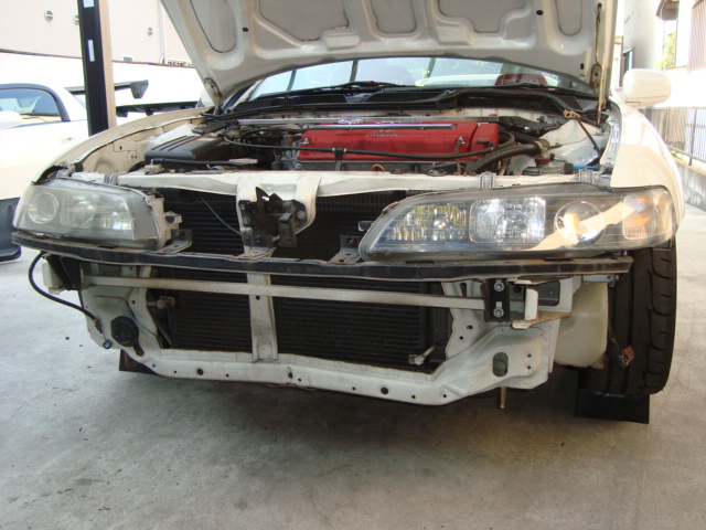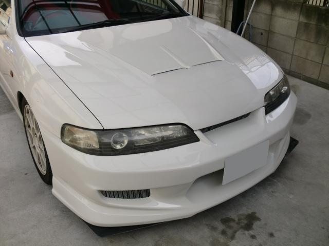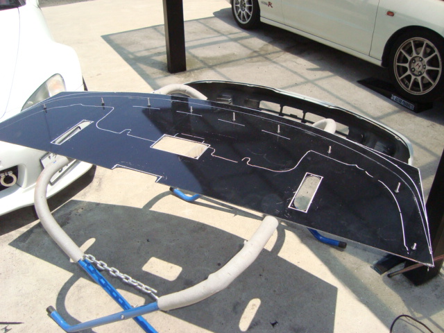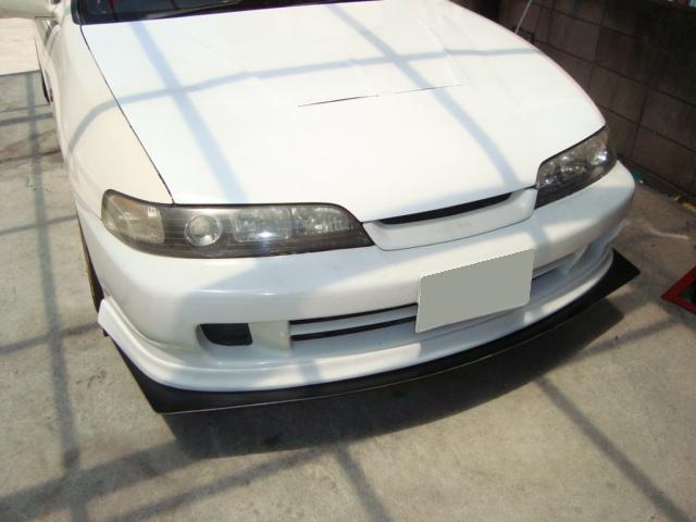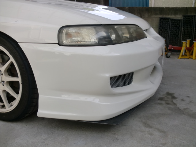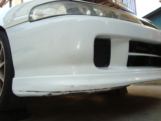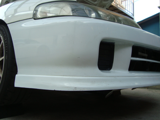 アンダーパネルを装着するには、純正リップスポイラーの加工が必要となります。 写真のようにDC2のリップは左右下部が低くなっているので、この部分をカットしてリップスポイラー下部全体が水平になるようにします。