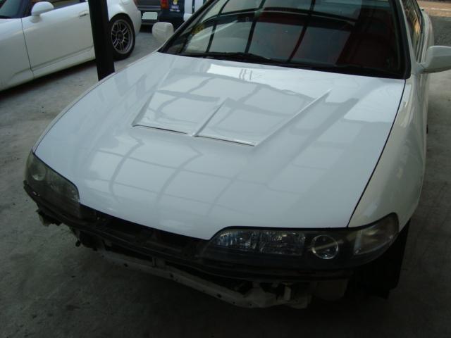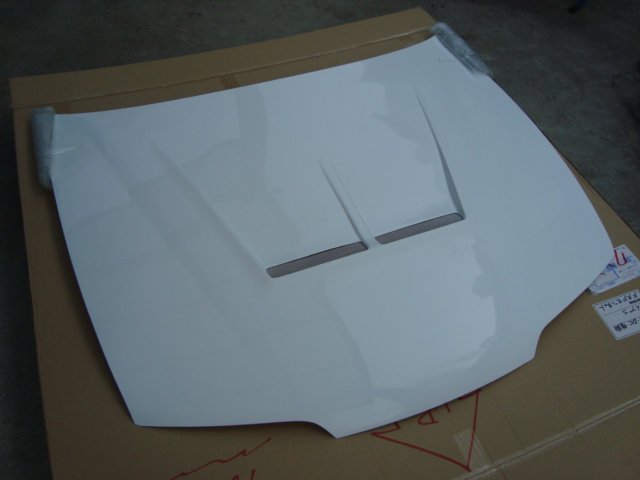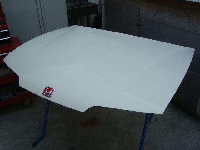 夕方になり暗くなってきたので、音の出るアンダーパネルの切り出し作業は中止して、エアロボンネットの取り付け作業をしましたよ。 高勢スタウトさんのところのFRPエアロボンネットタイプSです。 重さを量ることは出来ませんでしたが、純正ボンネットの半分くらいしかなさそう・・・。 フロントの重いFF車には強力な武器になりますね♪