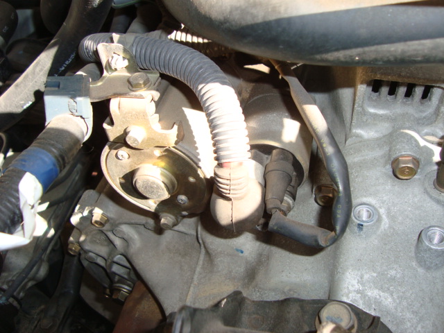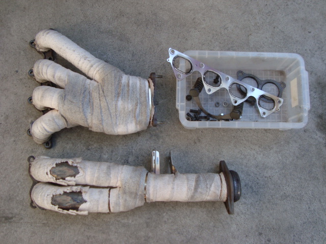 まずはエアクリボックス&エキマニを取り外して、ミッションとエンジンを連結しているボルトを取り外しやすくしますよ。 エキマニ、ガッツリ潰れちゃってるんですけど・・・。(涙)