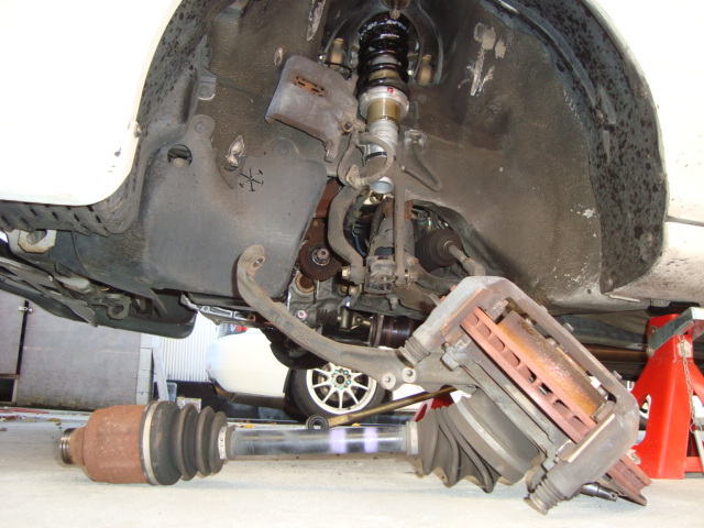 ドラシャはナックルごと外しちゃいます。 ドラシャだけ外すよりもこっちのほうが楽ですし、降りたミッションを引きずり出すにも都合が良いです。