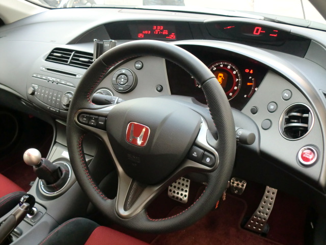 丸みを帯びていながらもシャープな感じのデザインですね。 ホンダアクセスのエアロは「付いてます!!」といった感じが全くなくて、とても自然な仕上がりです。 内装はFD2と同じように2段になったメーターパネルになっていて、ハンドルの「i」ボタンを押すとタコメーターの中心に映る表示が変わります。 オーディオはUSBの接続が出来るようになっており、エアコンも運転席と助手席の温度設定が別にできるなど・・・「TYPE R EURO」の個性がしっかりと出されています。 今後はもとはれさんの下でドライブやサーキットに駆り出されることでしょう。