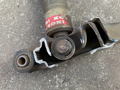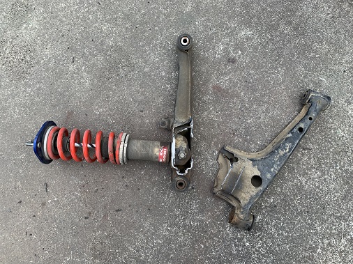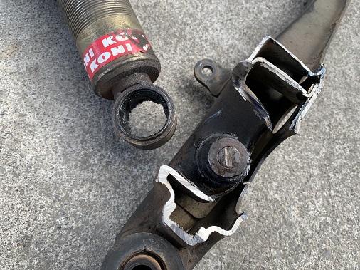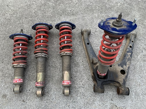 NBロードスターの KONIの車高調です。 オーバーホールの依頼をいただきました。 ありがとうございます♪ お持ち込みいただいた時、写真のように何故か 1本がアームに付いたままの状態だったので話を伺うと・・・「ボルトは緩んでいるが抜けない」とのこと。