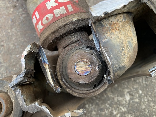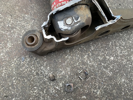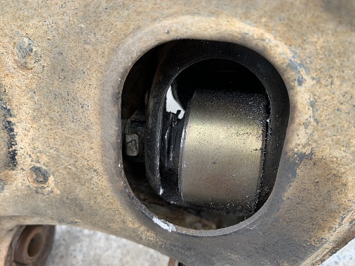状態確認のため、ボルトを回してみると・・・ブッシュが一緒に回ってしまいボルトが抜け出てきません。。。 お客様がブッシュの芯と一緒にボルトを切ろうと頑張った痕が残っていました。