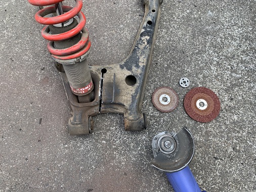 仕方がないのでアームを切り刻んで外すことにしたのですが、厚めの鉄板が使われていたり一部が二重構造になっていたりで結構大変。 ディスクグラインダ―のディスクがあっという間に使い物にならなくなったものの・・・