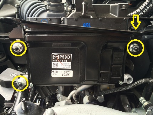 ボンネットを開けます。 エンジンルーム内の助手席側(写真の位置)に ECUがあります。 最初にバッテリーのマイナス端子を外します。 次にエレキコネクターを外します。 エレキコネクターはロックを外し、矢印で示したレバーを引き上げると外すことができます。(※コネクター内のピンが非常に細く折れる可能性があるため、まっすぐに抜き差しするよう注意してください) 〇で示したボルト 1個&ナット 2個を外します。