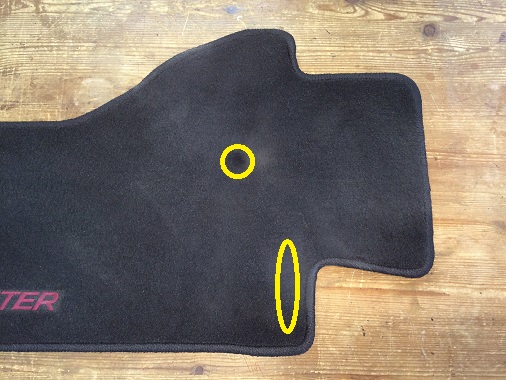 黄色く〇で囲った部分が凹んでしまったいるのが分かるでしょうか? 運転中、この部分にかかとが乗っているため、徐々に凹んできてしまいます。 まぁ、仕方がないといえば仕方がないのですが・・・足とペダルの位置関係が変わってきてしまうのが、スポーツカー乗りとして気になってしまいます。 そこで・・・