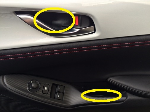 キット内にある取り付け説明書にあるように、黄色い〇印のところにビスが隠れています。 どちらもマイナスドライバーなどを使って外す(キズを付けないように注意して作業してください)のですが・・・下のほうが外せないというお問い合わせでした。 この蓋は何かで留まっているわけではなく、載っているだけです。 狭くてマイナスドライバーなどが上手く使えないときは、ガムテープなどで貼り付けて引っ張り出してください。
