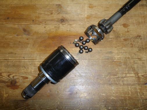 今日はドライブシャフトがブローした Arrows 86を積車で筑波サーキットから運んできましたよ。 現地ではブーツが捩れていなかったので「スプライン部分が破断したのかな?」と思ったのですが・・・Arrowsに運んで再度確認してみると、ブーツが捩れてるじゃん。。。 これはインボードベアリングが破損している(写真右側の円筒形のケースが回っているにも拘らず、ベアリングが破損してシャフトが回らないためブーツが捩れる)ってことじゃね??? 早速、中身を開けてグリスを拭き取ってみると・・・