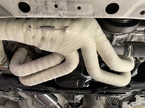 86/BRZはオイルパンを囲むようにエキマニが配置されているため、エキマニにサーモバンテージを巻くことは油温対策にもります。 油温が気になる方はオイルクーラーを装着する前にサーモバンテージを巻いてみてください。 エキマニの形状によってはかなりの効果を発揮しますよ。 また、Vベルトやラジエターホースの劣化を遅らせるためにもサーモバンテージはお勧めです♪