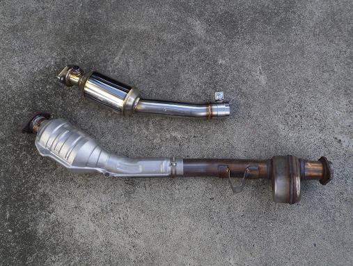 第1触媒のないスポーツタイプのエキマニは、第2触媒をスポーツキャタライザーにしたセンターパイプをセットにすることで保安基準に適合させています。 これに保安基準に適合したスポーツマフラーを組み合わせても、全体として保安基準に適合しなくなってしまう場合があります。 それは・・・保安基準に適合するマフラーのほとんどが、純正の第2触媒の後にあるサブサイレンサーとの組み合わせで騒音基準をクリアーしているからです。