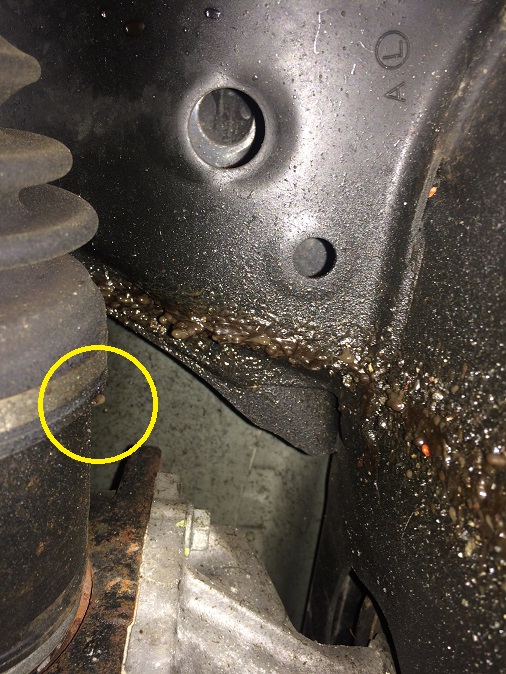 BRZの左ドライブシャフトインボードです。 他の修理作業の相談にご来店いただいたのですが、下回りを点検している時にグリスが飛び散っているのが見つかりました。 黄色い〇の部分からグリスが漏れ出しているのが分かっていただけると思います。 峠は走りに行くけど、サーキットは走らないから安心・・・とは言えないようです。