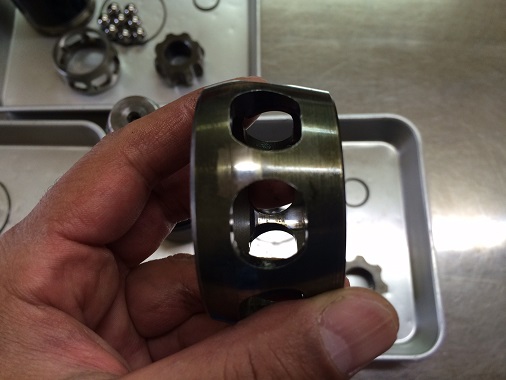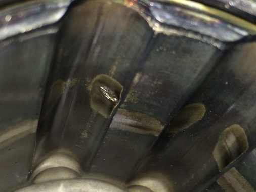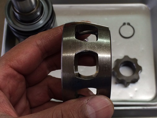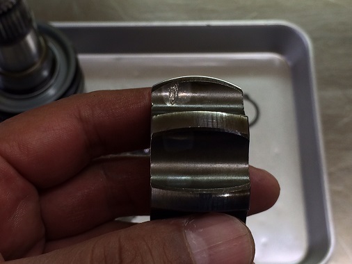 「OH後約 40,000㎞走行したインボード(右側)」の写真です。 ケース内側やインナーには写真では確認できない小さなフレーキングと呼ばれるキズ(剥離)が出来ていました。 ケージ(リテーナー)の外側の摩耗が進んでいました。