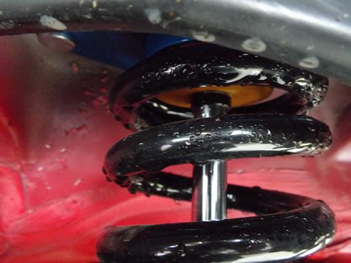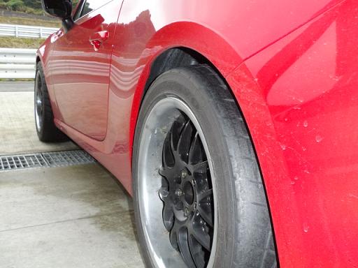 で、走ってみると・・・フロントもリアもかなり厳しい状態でした。。。(汗) リアは切り詰めたバンプラバーにタッチしています。 一般的なスプリングのレートよりも硬くしてきた(レートはナイショです♪)のに・・・。(涙) 路面は完全なウェットなのでスプリングの硬さは感じるものの、前後バランスは悪くはなさそうです。