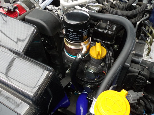冷却水のリターン用アダプターの取り付けに時間を要しました。。。(苦笑) エンジン後方インマニ下に取り付けるのですが・・・手は入るものの、ツールをまわすクリアランスが取れず苦労しました。 人気の出そうな商品なので、専用のツールを作っておこうと思います♪