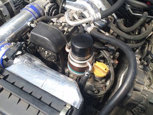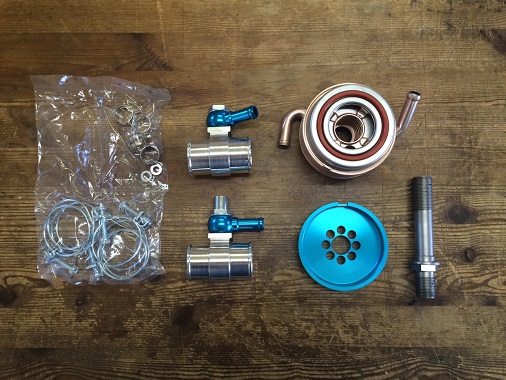 オイルフィルターの下にあるのが水冷式オイルクーラー本体になります。 コアの放熱性能は 4000kcal/hで一般的な空冷式オイルクーラーコアの約半分となりますが、サーキット走行でも十分な性能を発揮します。