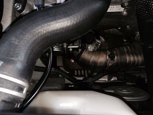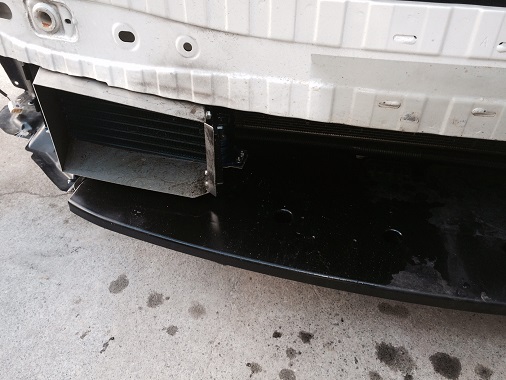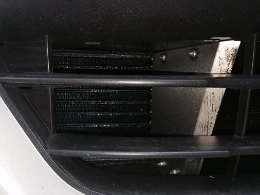 BRZに装着されているオイルクーラーからオイルが漏っているということで、状態の確認&修理を依頼されました。 フロントバンパーの間からオイルクーラーコアを覗いてみると・・・ご覧の通り、オイルまみれでした。(汗) 下回りを見てみると・・・