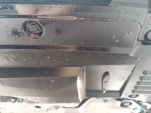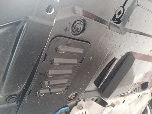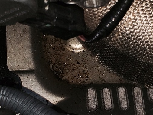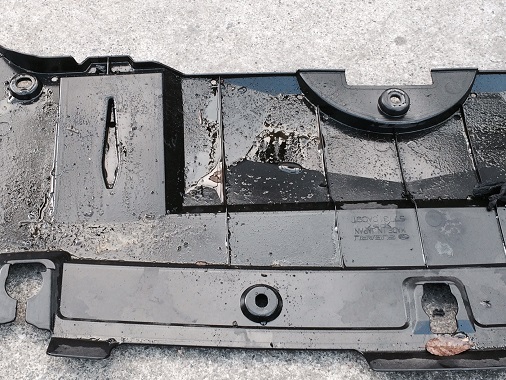 ボンネットを開けて中を見てみると、アンダーパネルにオイルの海が・・・って、これ、マジで火災になる一歩手前です。(滝汗) 本当に燃えなくて良かったですね。。。