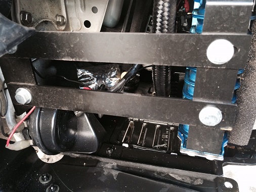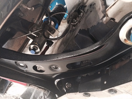 スマホで撮った写真なので分かりにくいかもしれませんが、フロントのロアアームもオイルでべっとりでした。 右側に写っているピロブッシュはオイルが滴っています。アーム上のパネルもオイルで色が変わっているのが分かると思います。 ブレーキやタイヤにかかっていたら大惨事だったかもしれません。。。(汗)