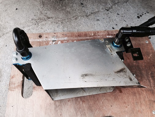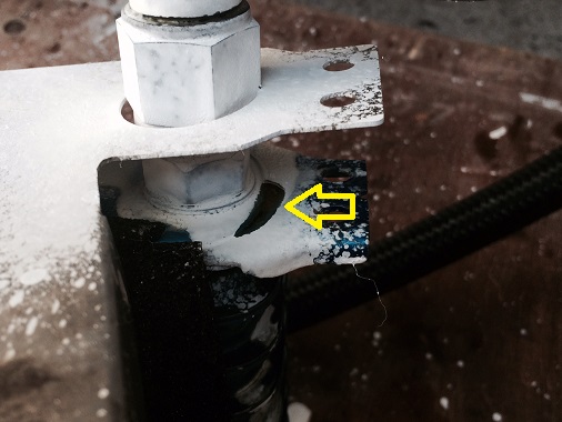 ホースをつないだままオイルクーラーコアを取り降ろし、エンジンを掛けてオイル漏れをチェックしてみると・・・フィッティングの付け根にクラックが入っているのを発見!! みるみるうちにオイルが溢れてきました。。。(汗)