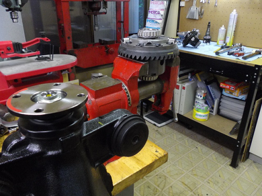 86のデフはS2000のように万力で挟めないので、写真のような治具(と言うほどの物でもありませんが)を使って固定します。 バックラッシュと歯当たりを調整したら完成ですよ♪