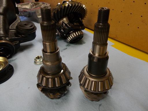 ピニオンギアにはS2000同様、リジットタイプのディスタンスカラー(写真右)を使いますよ。 純正のディスタンスカラーは、押し潰しながらピニオンギアのプレロードを決めるため作業効率は良いのですが、長い間使っていると自然に潰れてバックラッシュや歯当たりが狂い、思わぬトラブルを招くことがあります。 Arrowsでは、潰れることのないリジットタイプのディスタンスカラーを使うことでトラブルの防止に努めています。