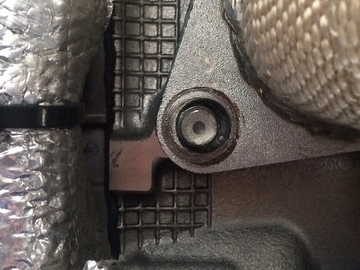 続いて、キャタライザーをサポートパイプから外そうとしたら・・・ナットが固着して外れません。(汗) このままでは作業が進まないので・・・無理やり回したらスタッドボルトがねじ切れました。(涙)