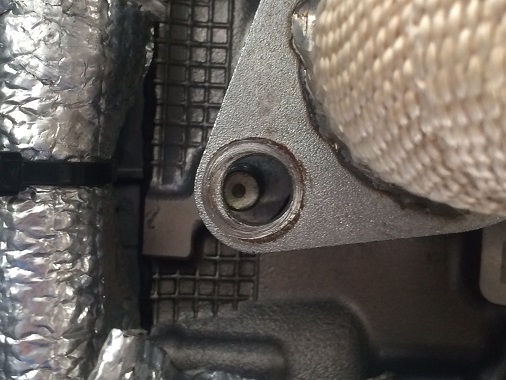 外したエキマニを取り付けてみようとしたところ、スタッドボルトとエキマニの穴がこれだけズレていることが判明。 これでは引っ掛かって外れませんね。(苦笑) どうやら熱でエキマニが歪んでしまったようです。
