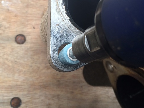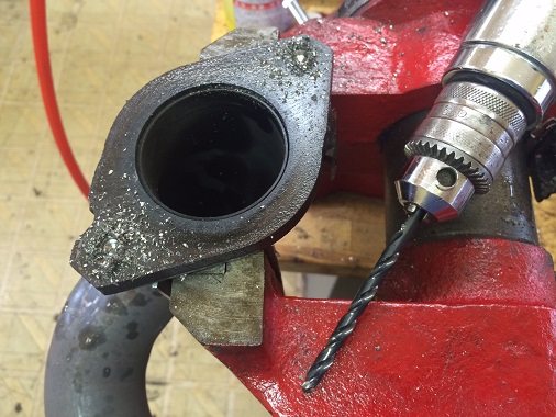 お客様と相談した結果・・・今回はとりあえず、このままエキマニを使う方向で進めることになりました。 ということで、エキマニの穴をスタッドボルトが入るようにリューターで拡大加工します。