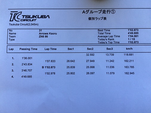 結果は 1分2秒873でベスト更新!! NA 2.0L ノーマルエンジンのまま、3秒台の壁を突破することが出来ました♪