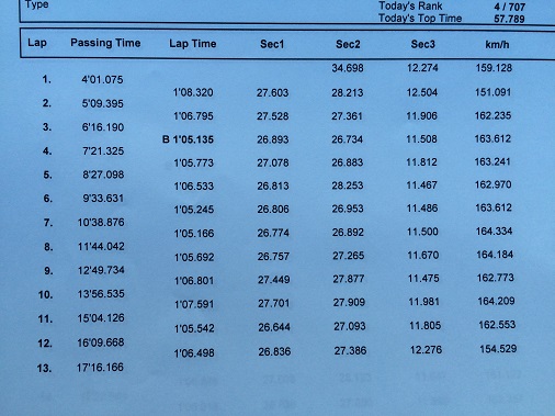 結果は 1分5秒136と平凡なタイムでしたが・・・11月の 13:55~の走行だった(気温が低くなかった)にもかかわらず、バックストレートの計測地点で 164km/hを記録していたのにはちょっとビックリ。 半年前の POTENZA & Prodraive CUPの時は 159km/hで 1分4秒728だったので、同じ枠を走るクルマの台数が少なければ(他のクルマに引っかかることがなければ)もう少し良いタイムが出たかもしれませんね。